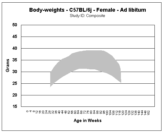 References - Females - Body Weights Economos AC, Miquel J. Usefulness of stochastic analysis of body weight as a tool in experimental aging research. Exp Aging Res 1980 Oct;6(5):417-30. ID:7227409 Kohn RR. Effect of antioxidants on life-span of C57BL mice. J Gerontol 1971 Jul;26(3):378-80. ID:5124518 Turturro A, Witt WW, Lewis S, Hass BS, Lipman RD, Hart RW. Growth curves and survival characteristics of the animals used in the Biomarkers of Aging Program. J Gerontol A Biol Sci Med Sci 1999 Nov;54(11):B492-501. ID:10619312